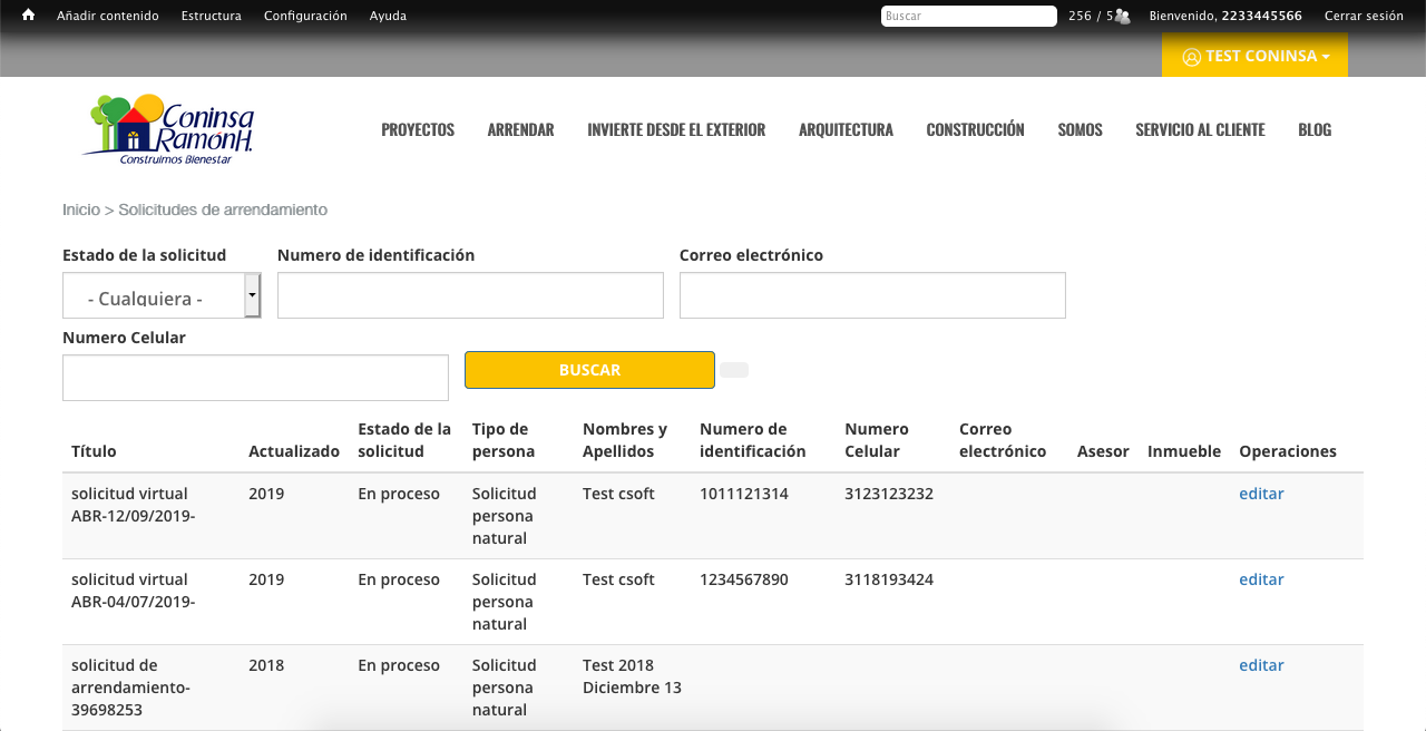 Si eres Asesor puedes gestionar las solicitudes creadas por los clientes, podrás editar, listar, ver, solicitar documentación, cambiar estados y generar el documento de solicitud de Arrendamiento.