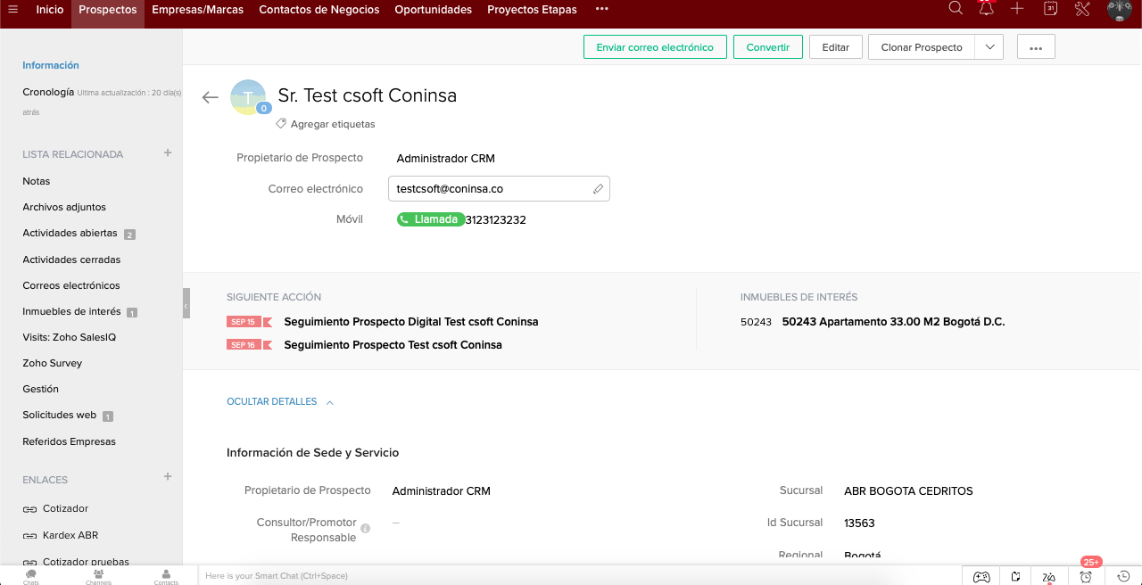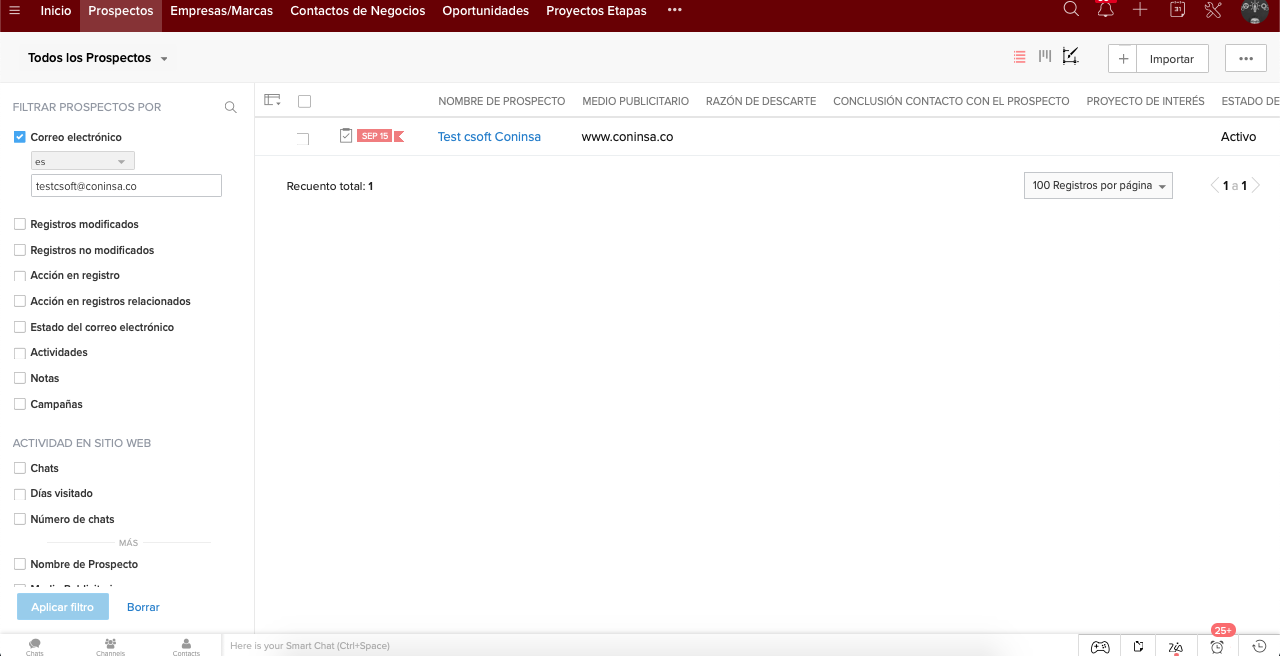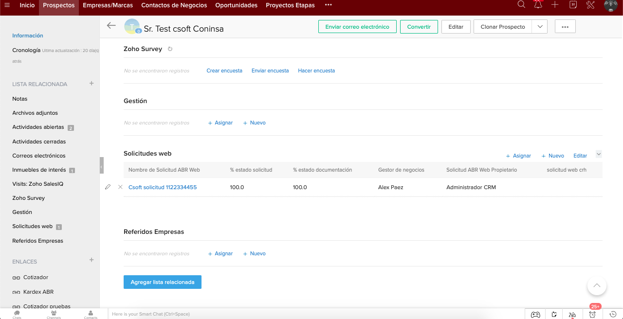 Cada solicitud en el portal web, pasa a ser un prospecto en ZOHO CRM.
